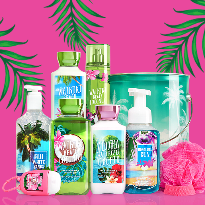 Aloha Hawaii bucket (with Waikiki Beach Coconut, Honolulu Sun, Aloha Waterfall Orchid scents): $30 with $30 purchase