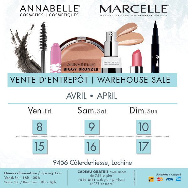 Annabelle/ Marcelle: Montreal warehouse sale starts today, goes on until Sunday, then repeat the week after, Friday – Sunday.