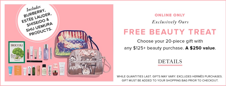 Online only: free 20-piece gift ($250 value) with $125+ beauty purchase (excluding Hermes).