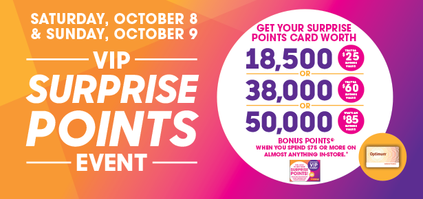 *** Saturday & Sunday: VIP Surprise Points event, in stores only – get a card worth 18,500/ 38,000/ or 50,000 bonus points ($25/ $60/ or $85 value) with $75 purchase.