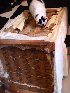 Remember to wear work clothes that you don’t mind getting dirty. Pulling off old upholstery is sort of like pulling up old carpets….it’s dirty work. And can be more than a little gross, if you don’t mind me saying.
